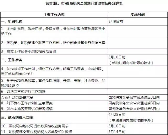 各级税务机关在营改增准备工作中,要加强部门职能整合,完善工作机制,统一扎口管理。主要领导靠前指挥,根据《各省(区、市)税务机关全面推开营改增任务分解表》(见附件),结合实际进行梳理和细化,统一时间节奏、统一工作流程、统一操作标准、统一质量控制。按改革目标倒排工期,制定时间表、路线图,任务逐条分解到岗、责任到人,确保改革有序推进,落实到位。
